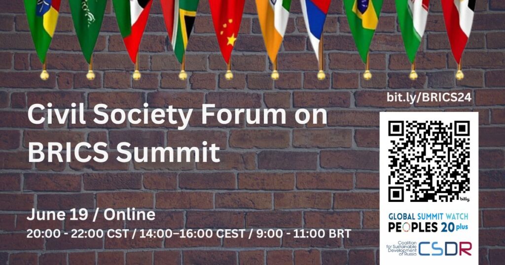 Global Summit Watch of Peoples 20 plus and Coalition for Sustainable Development of Russia (CSDR) will jointly organize Civil Society Forum on BRICS Summit on June 19, 2024, online.