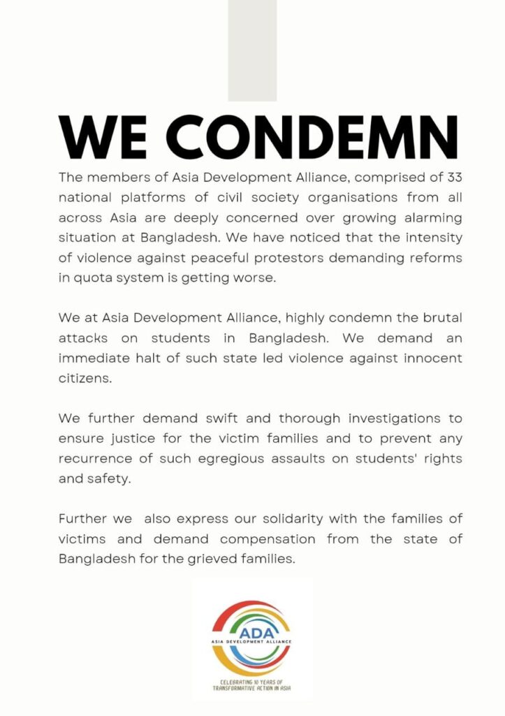 The members of Asia Development Alliance, comprised of 33 national platforms of civil society organisations from all across Asia, are deeply concerned over growing alarming situation at Bangladesh. We have noticed that the intensity of violence against peaceful protestors demanding reforms in quota system is getting worse.