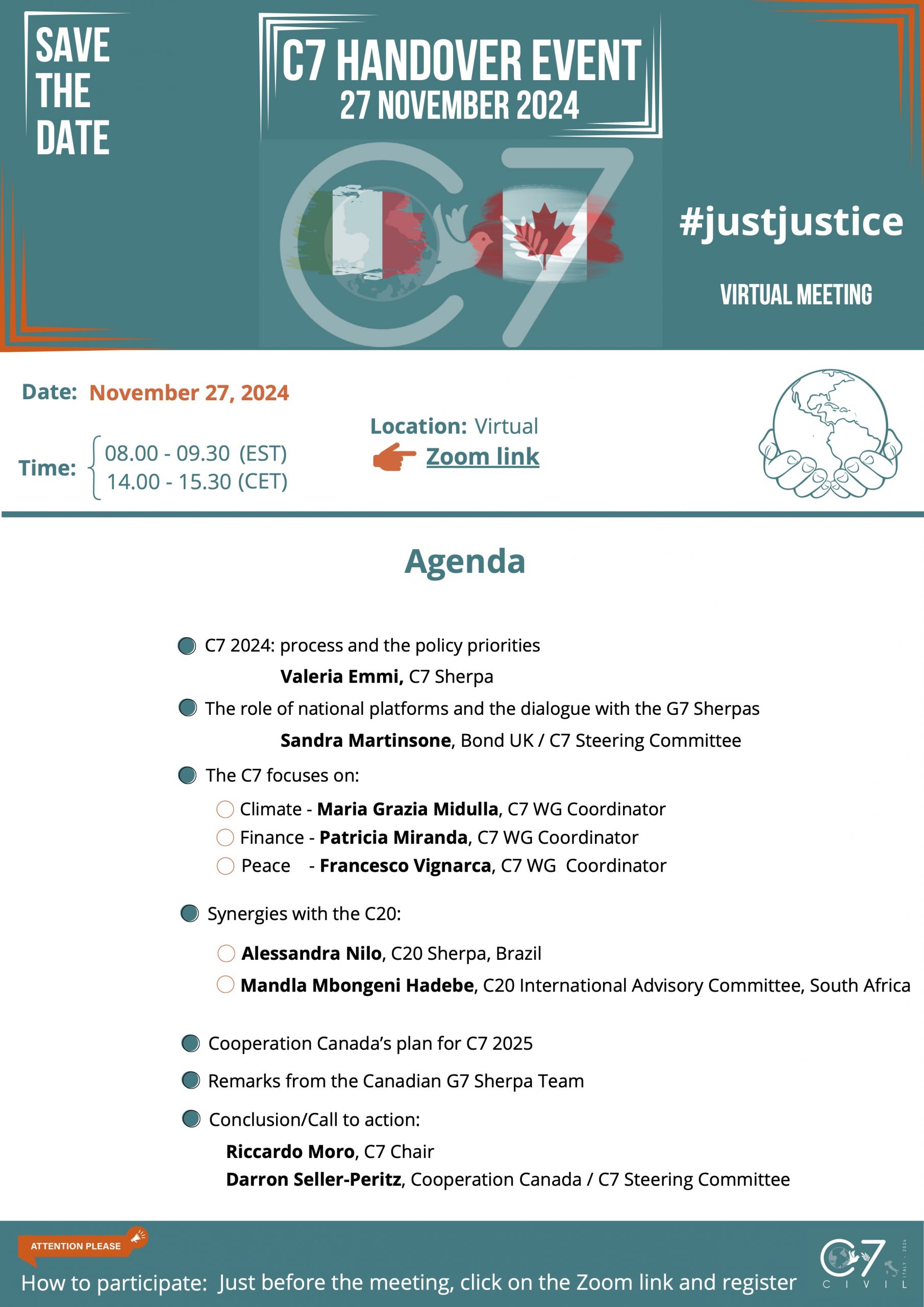 The Italian Presidency of the G7 is over and we, Civil7, are handing over the process from Italy to Canada. You are all invited to attend the official C7 handover event that will be held virtually on 27 November.