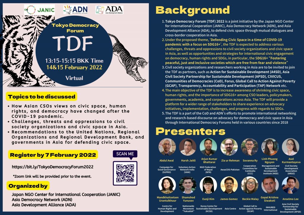JANICでは、2020年・2021年に続き、アジア各国から13のCSOと研究者を招き、「東京民主主義フォーラム」をオンライン形式で2022年2月14日・15日に開催した。アジア10カ国のCSOの市民社会スペースに関する調査結果をもとに、SDG16+を中心に、COVID-19が大流行する中でいかに民主的に市民社会スペースを確保できるかを議論した。