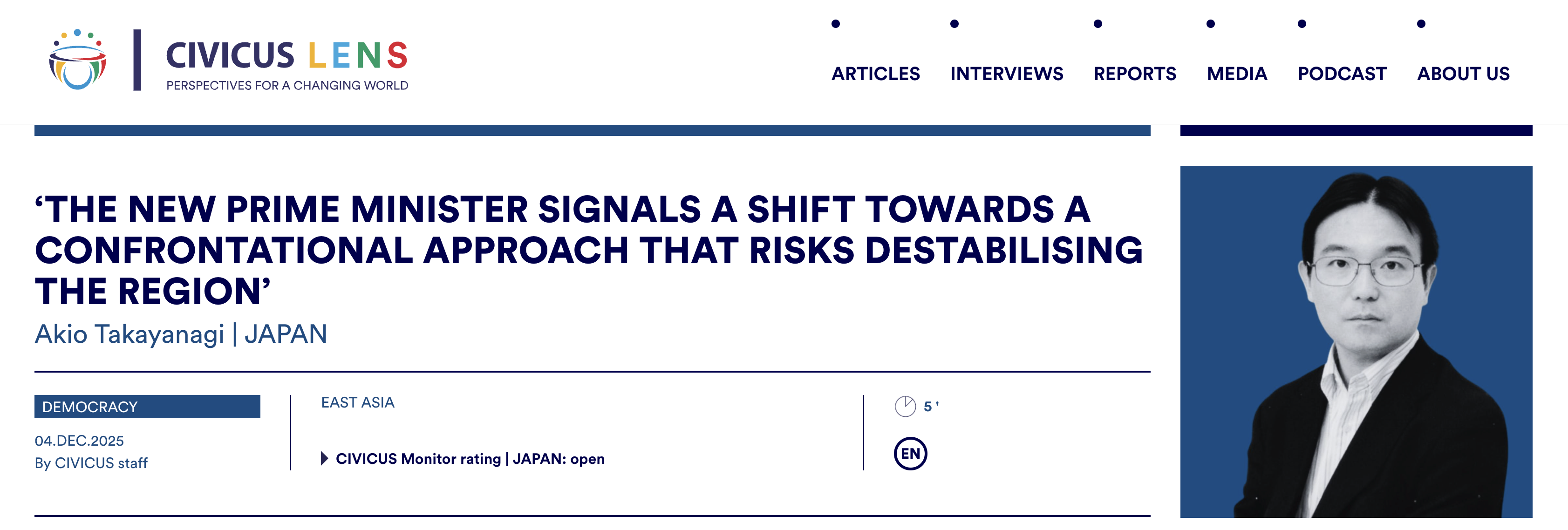 - 【メディア掲載】高市総理大臣の就任と地域情勢や市民社会スペースに与える影響に関す…