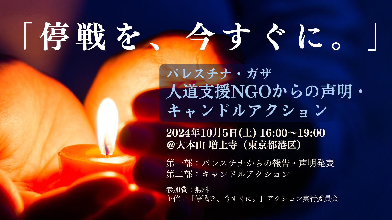 10月5日には、東京・増上寺にて、今回の共同声明文を読み上げ、現地の人々の状況を改めてお伝えする報告会、犠牲者の追悼と停戦への願いを込めたキャンドルアクションが実施されます。報告会、アクションともに、どなたでもご参加いただけます。