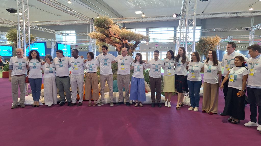 イタリア・バーリに設置された国際メディアセンター(IMC)で活動しているC7関係者は、「G7は問題の一部にもなり、解決策の一部ともなる」というメッセージを掲げたTシャツを着用してフラッシュモブを実施しました。