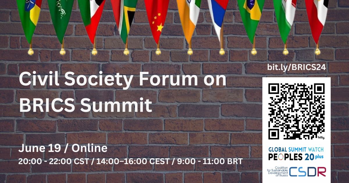 2024年6月19日(水)、Peoples 20 plusCoalition for Sustainable Development of Russia(CSDR)はBRICSサミットに関する市民社会フォーラムをオンラインで共催します。