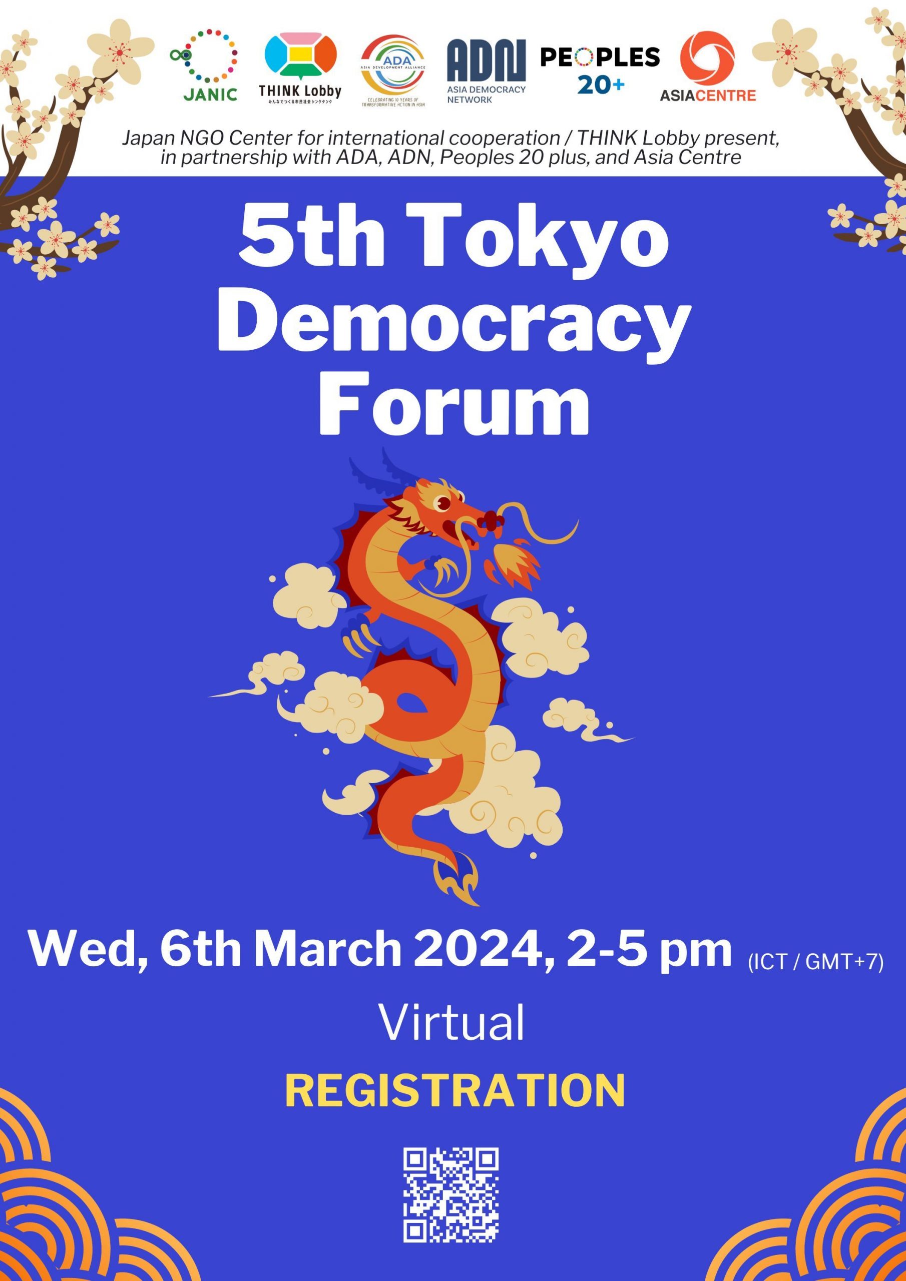 特定非営利活動法人国際協力NGOセンター(JANIC)/ THINK Lobbyは3月6日、オンラインで「第5回東京民主主義フォーラム(TDF)-アジアにおいて民主主義と市民社会スペースを守る(DDCSA)-」を開催しました。